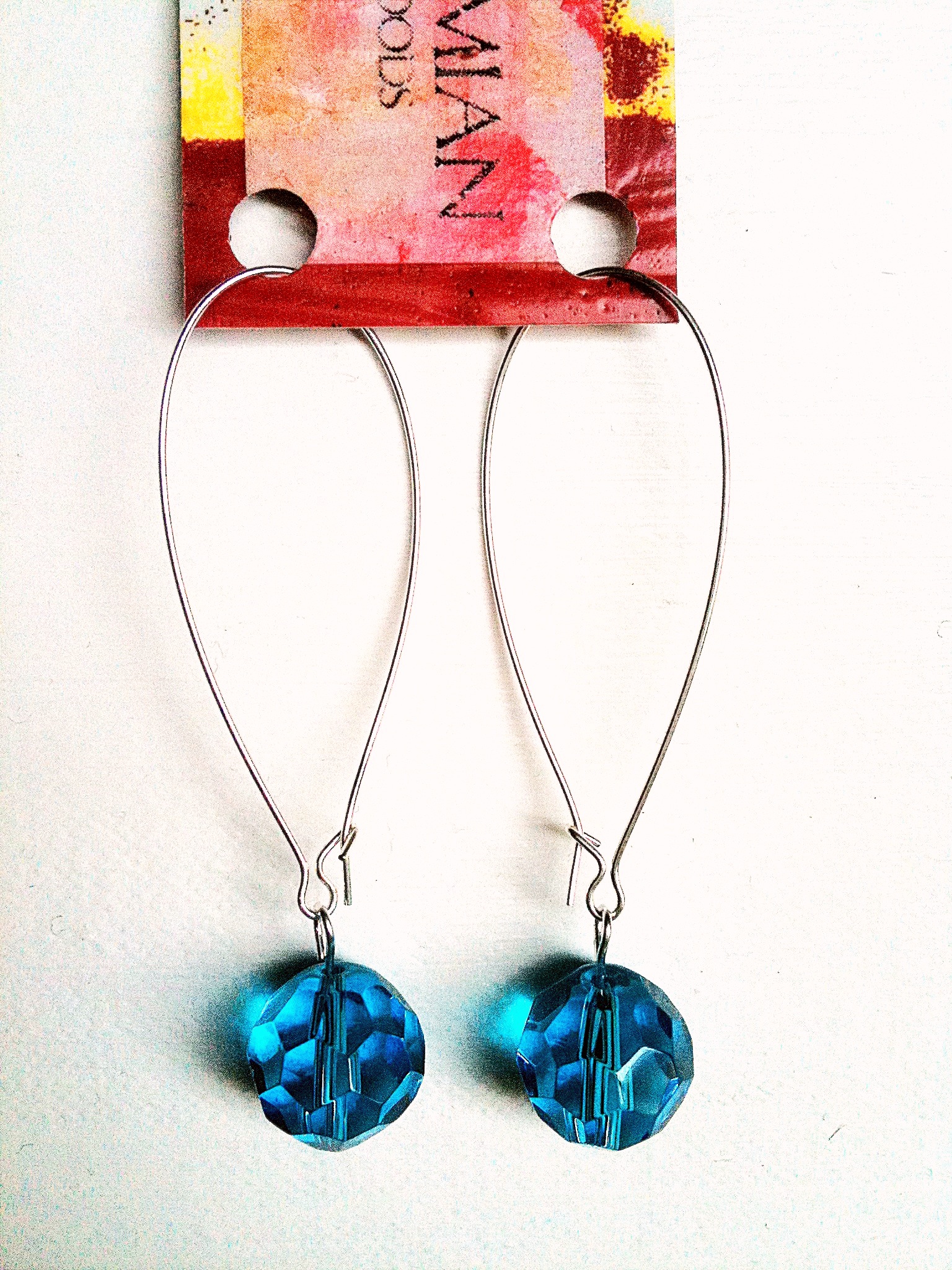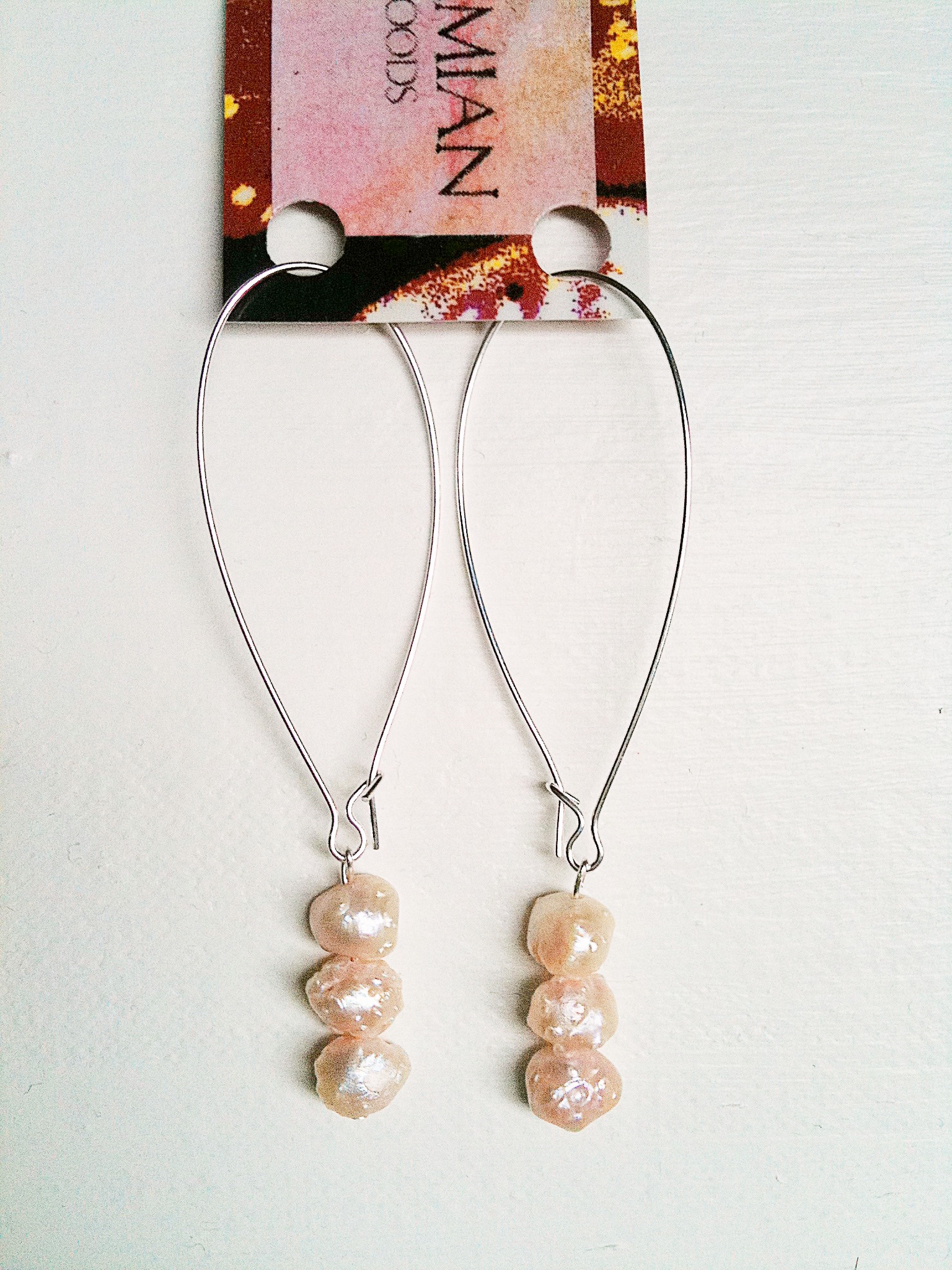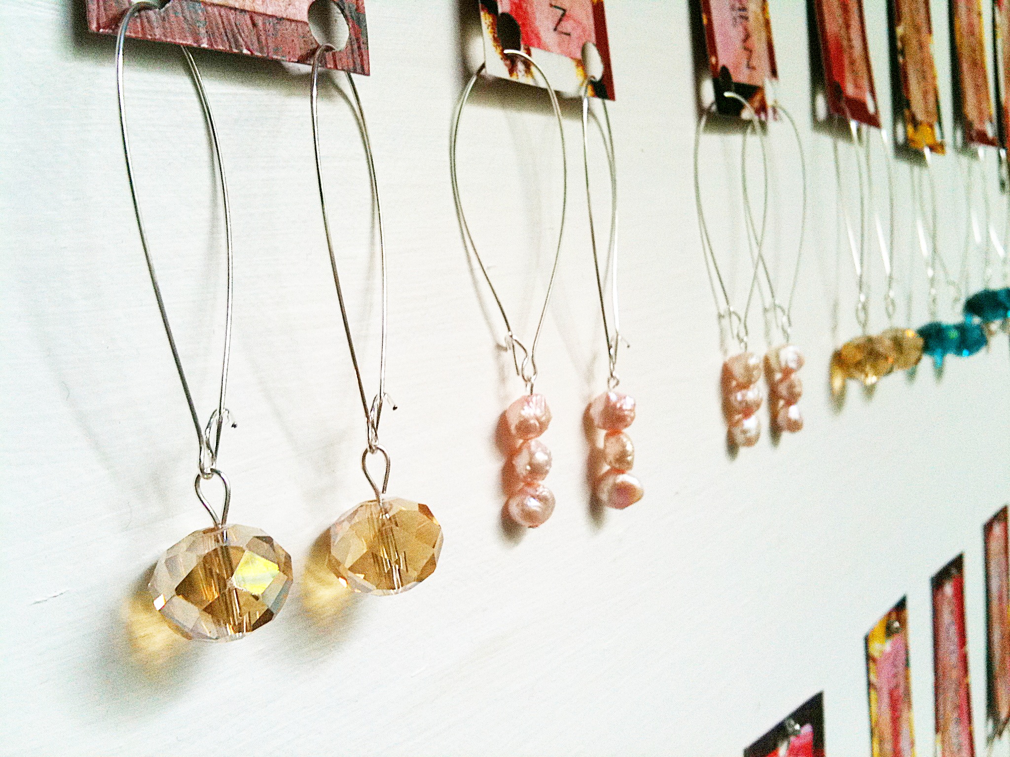 It's a warehouse with every kind of bead and finding imaginable and just being there made me want to make things. I found myself irresistibly drawn to these strings of crystals and pearls and found these silver findings to go with them. I made this display out of a damaged painting in a frame from Goodwill and these are available at my neighborhood vintage shop behind the counter for purchase!